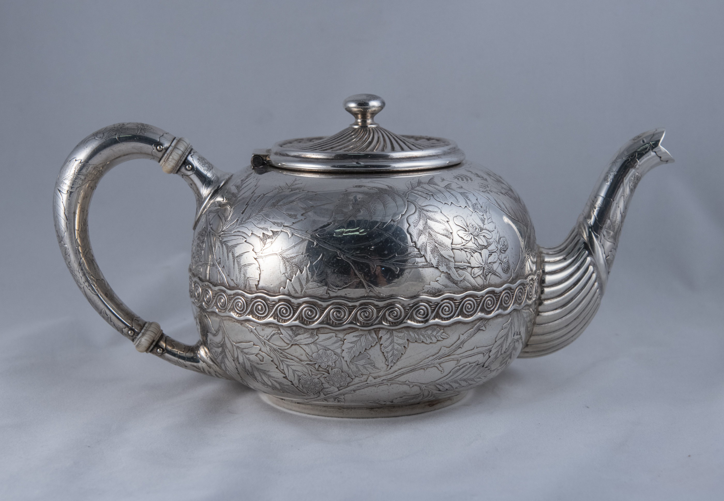 An incredible Gorham sterling silver teapot in the 1840 pattern from 1887. With a birdie on a limb.