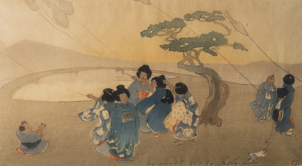 I have two great new works by Bertha Lum, the woodblock Kites and Waiting for Ganesha, a raised line print. Lum won the Japanese award for printmaking in 1904, unheard of for a western women. Waiting for Ganesha is actually a monotype, a watercolor, a technique that she developed herself in Chicago while creating stained glass.