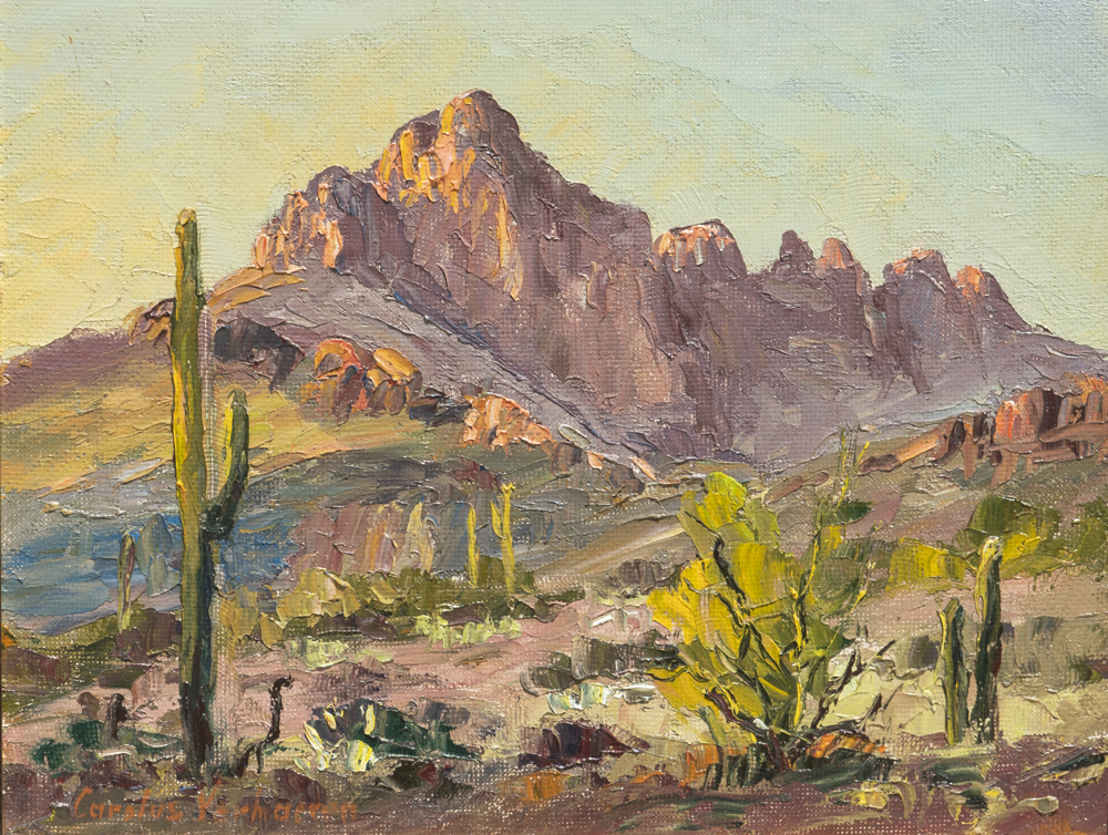Carolus Verhaeren (1908-1956) is a beloved painter from La Jolla, known for his free slinging of paint and his unfortunate termination in a phone booth in 1956. This oil on canvas laid to board measures 12 x 16″. You can still see much of his work hanging in the La Jolla Country Club.
