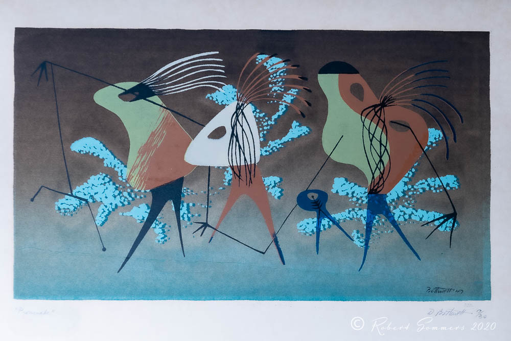 Once I sell a print it is rare to ever get it again. And so I was a bit sad when I sold this 1947 print by Dorr Bothwell (1902-2000) last year, arguably her greatest print ever, Promenade. But lo and behold, I recently got another one in the mail, from a woman who lives in the south. From an edition of thirty 17/30, good condition, full margins, faint creasing. Pencil signed, good color. Call for price.