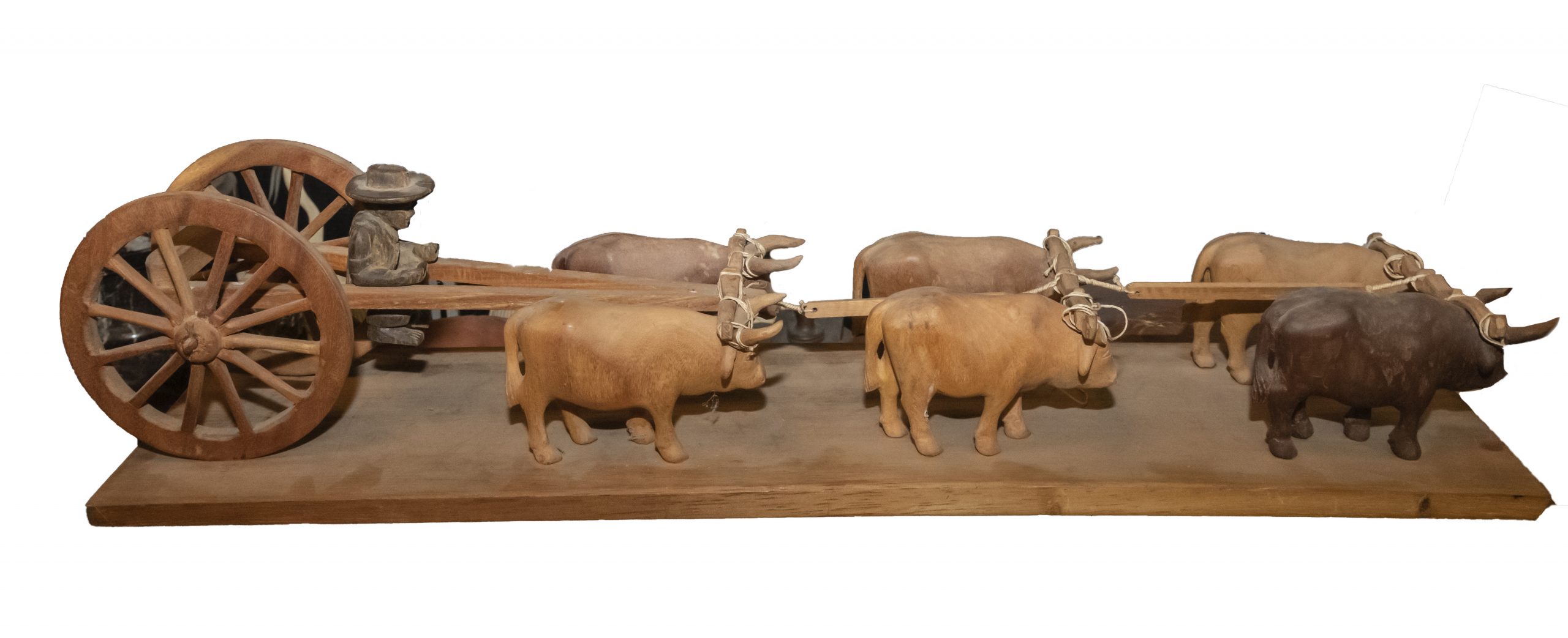 Lovers of folk art will appreciate this hand carved wooden cattle team. It measures 32″ in length and is a real wonder. Not sure if it articulates or reticulates but the pieces do move!