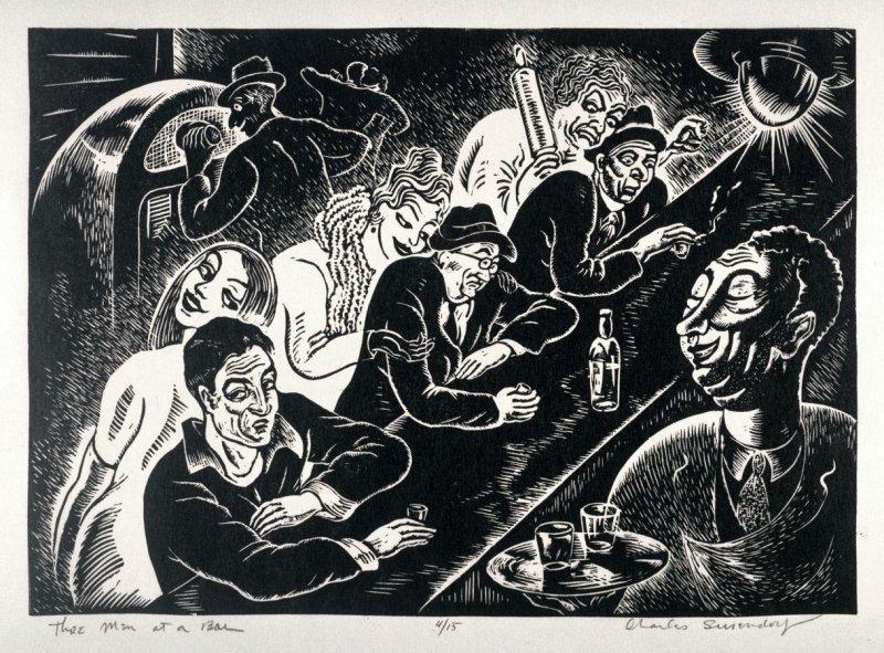 Guy had a great hand and a sharp eye, as we say in the business. I have sold quite a few of his pieces over the years. More people should know about him but that only happens if you live in New York. The next print is my favorite of his, sold it about ten years ago but still love it. Wish it was mine again. Three men in a bar.