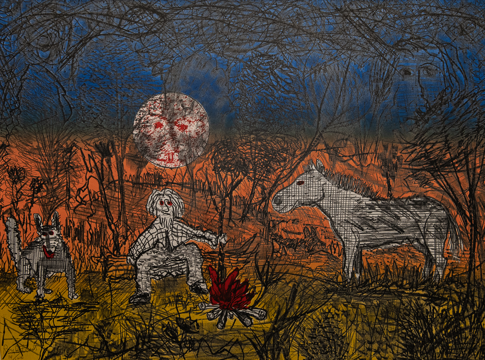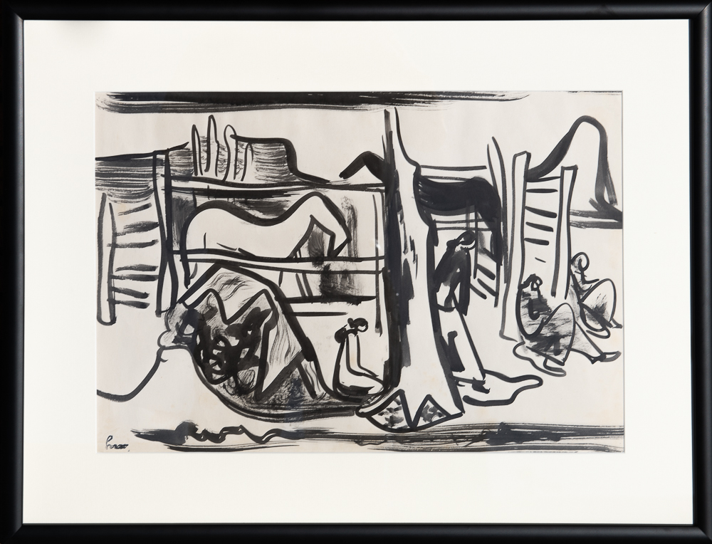Sticking with the earlier modern primitivist theme, I present two lithographs by Roy De Forest (1930-2007). Ass for every saddle, as we say in the business. And speaking of saddle, the untitled color one of the man and horse at the campfire is quite large at 22 1/2 x 30 1/4″. 19/100, mint unframed.