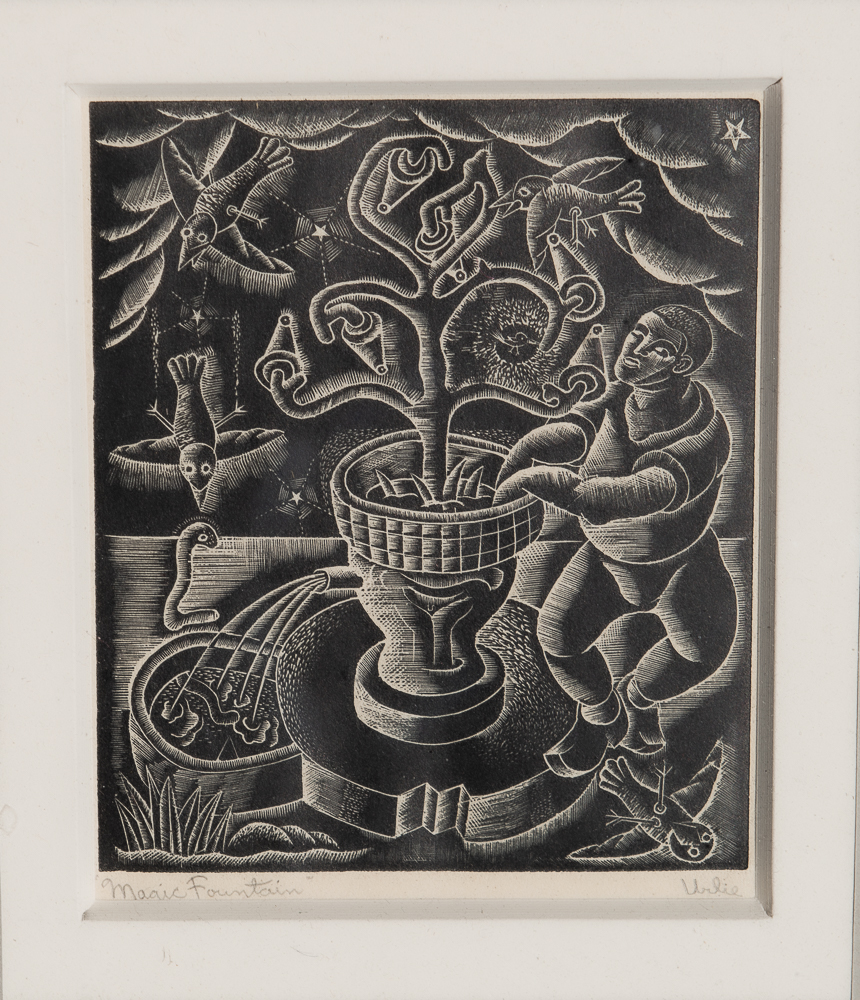 This is a linocut from Charles Frederick Surendorf (1906-1979) titled God comes down to inspect his creations. Surendorf was a Northern California artist with a keen eye and a biting pen, often quite satirical in nature. You get the idea that the creator might not be too happy when he sees the kind of mischief man is up to. From the first edition of 100 on what I believe is Van Gelder paper. It measures approx. 14 x 18″ image. All the human vices depicted in one powerful image and social commentary. This one was pulled in the early 1940’s. There is another smaller work with the same title that he produced in 1938, also very good.