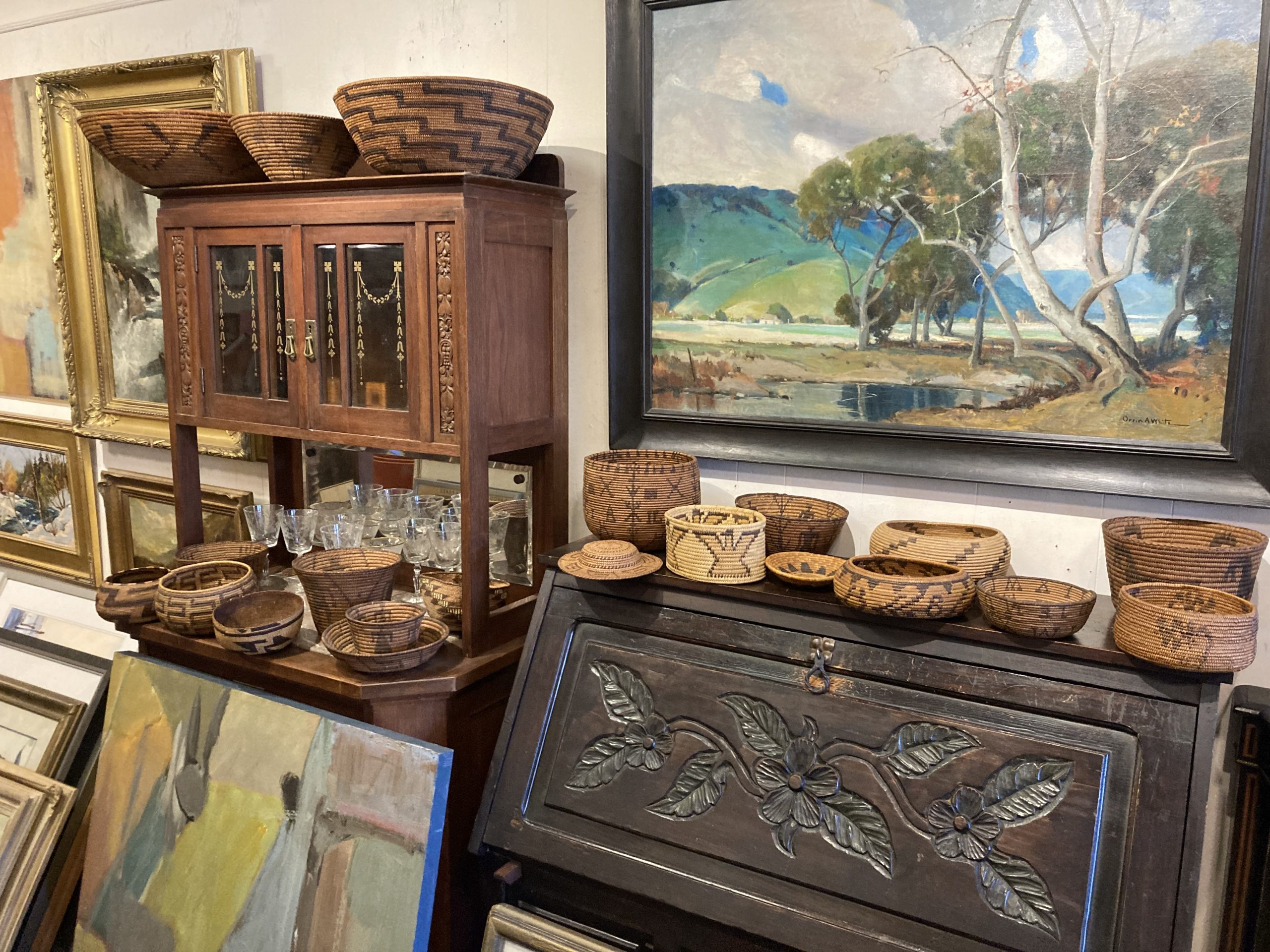 It is hard to describe just how much native material I have as you can partly see from some of the baskets above. The furniture piece to the left is a secessionist cabinet from Austria. The Vienna address of the maker is written on the back of the drawer. It has lovely carving and a beautiful inlay in the lower doors which you can not see from this picture.