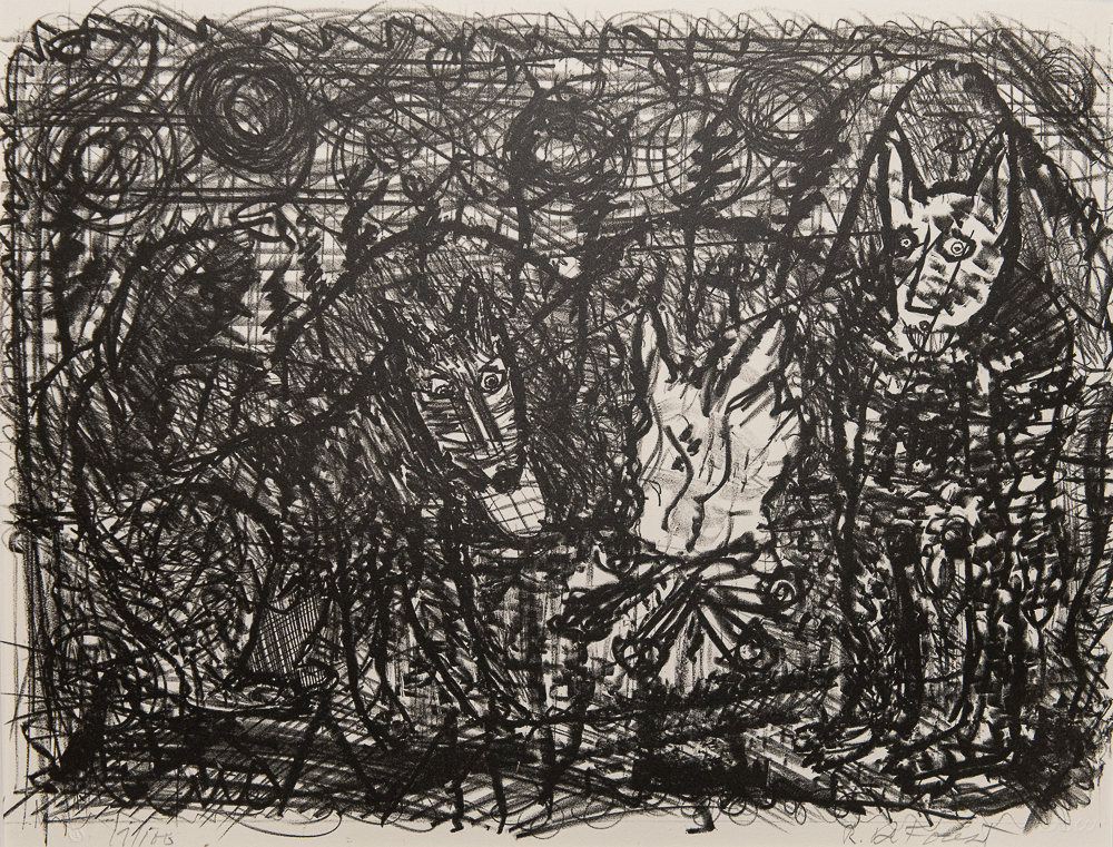 The black and white is cool, like a psychotic Franz Kline. 18 x 23″ 7/100 pencil signed with artist watermark.
