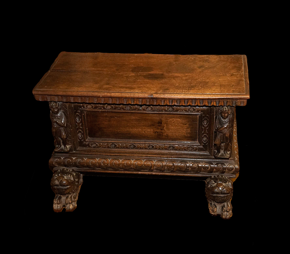 The piece to the right is a Spanish Colonial vargueño desk from South America, rougher than the revival pieces you see from the 1920’s and with atypical carving.