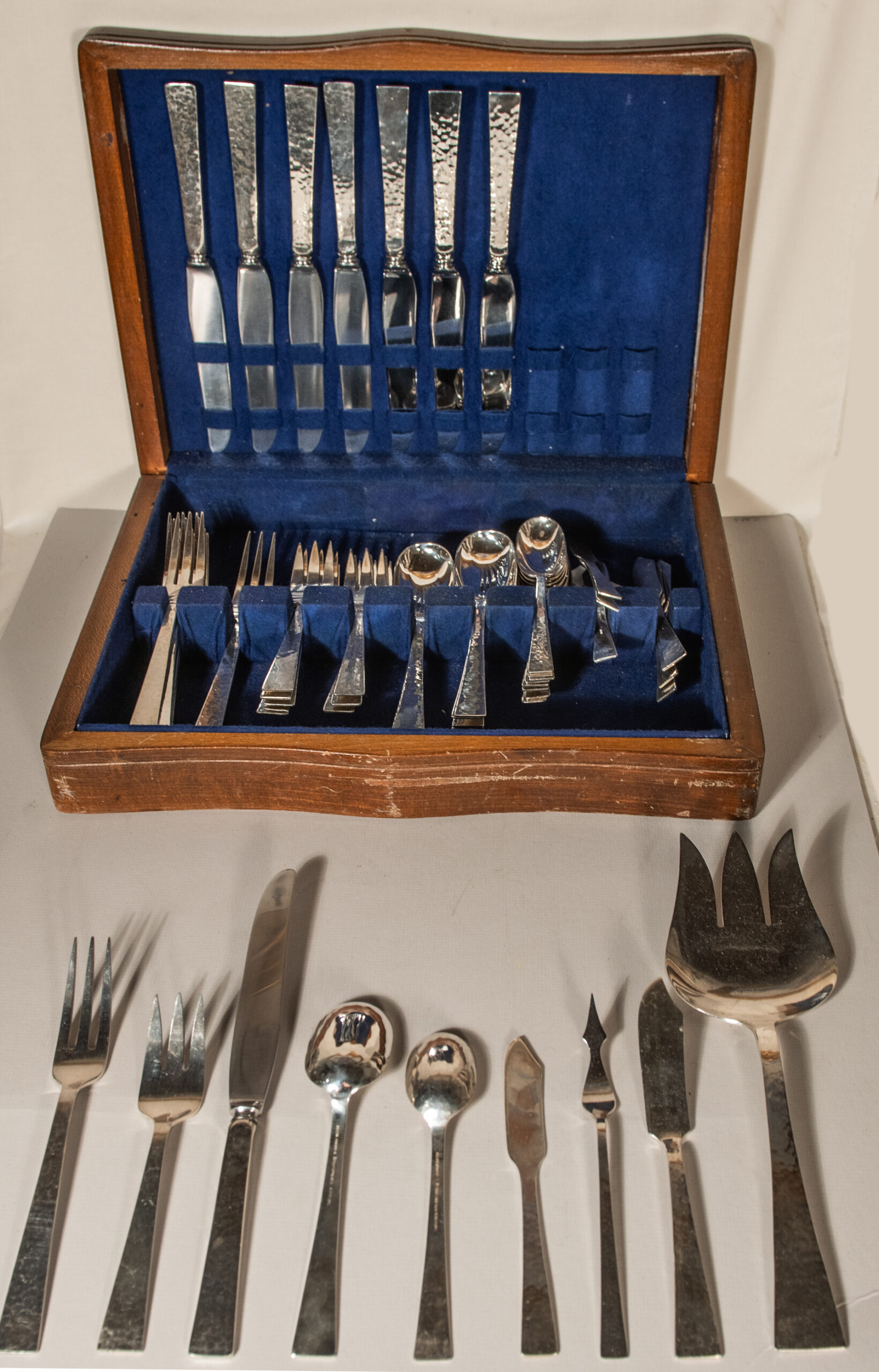 An Allan Adler (1916-2002) sterling silver hand hammered service for eight, six across, with three extra serving pieces in the Starlit pattern.