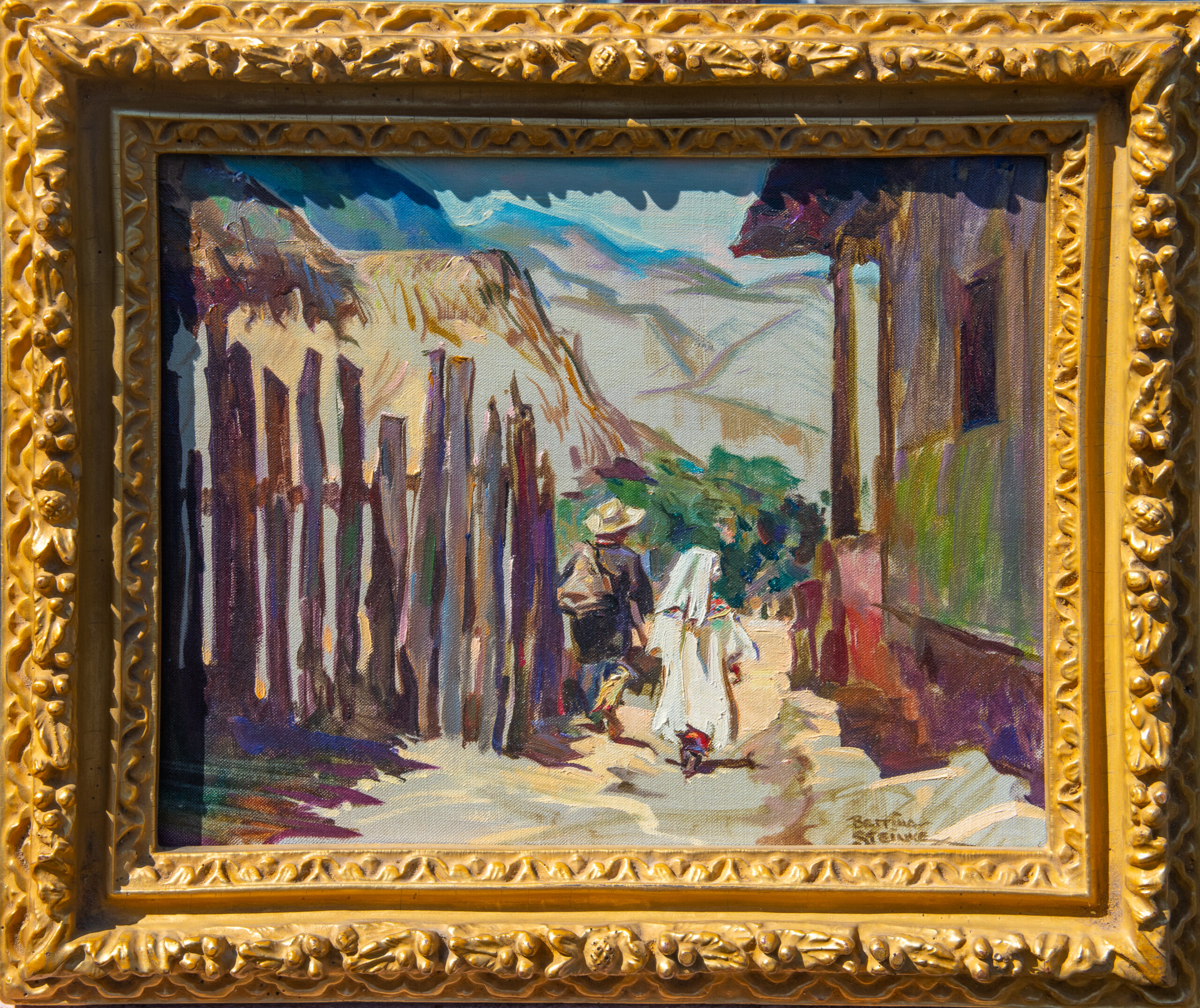 A classic Taos street scene woodcut by the late Barbara Latham (1896-1989).