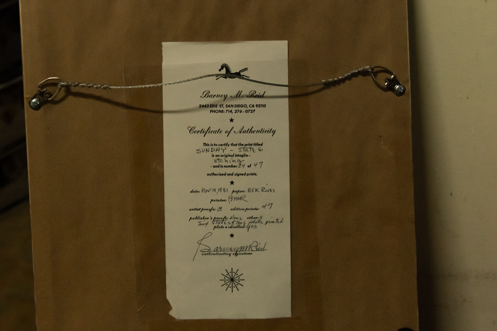 Born in Los Angeles, Barney Reid was raised in Yuma, Arizona. After undergraduate studies at Arizona State University in Tempe and at the University of California, Los Angeles, he pursued an MFA at the University of Iowa where he studied printmaking with Grant Wood. He taught art at Yuma High School before enlisting in the Army Air Corps during World War II. Upon release from the service, he taught art at Arizona State University from 1946 to 1949. He moved to San Diego in 1950 where he became, according to fellow artist Kay Whitcomb, the 13th member of the Allied Craftsmen of San Diego. This organization was founded in 1947 to promote cooperation among craftsmen and to encourage greater public interest in contemporary craft. Reid served as president of the organization in 1953.