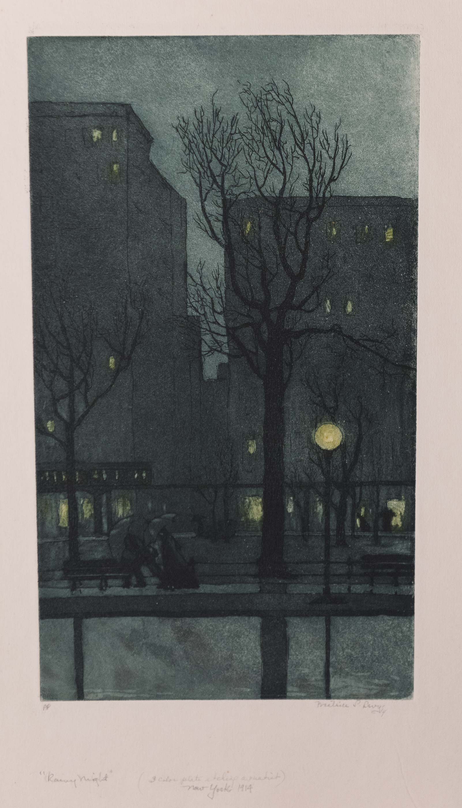 Rainy Night 3 color plate etching aquatint, New York 1914, 14 x 8″, pencil signed and dated, pp l/l soldBeatrice Levy (1872-1974) etching Aldine Square (alternate title is Delivery in Old Town) 1938 ed. 9/50 6.5 x 10″ – includes her Chicago Street Address on bottom margin – unframed pencil signed and dated price on request