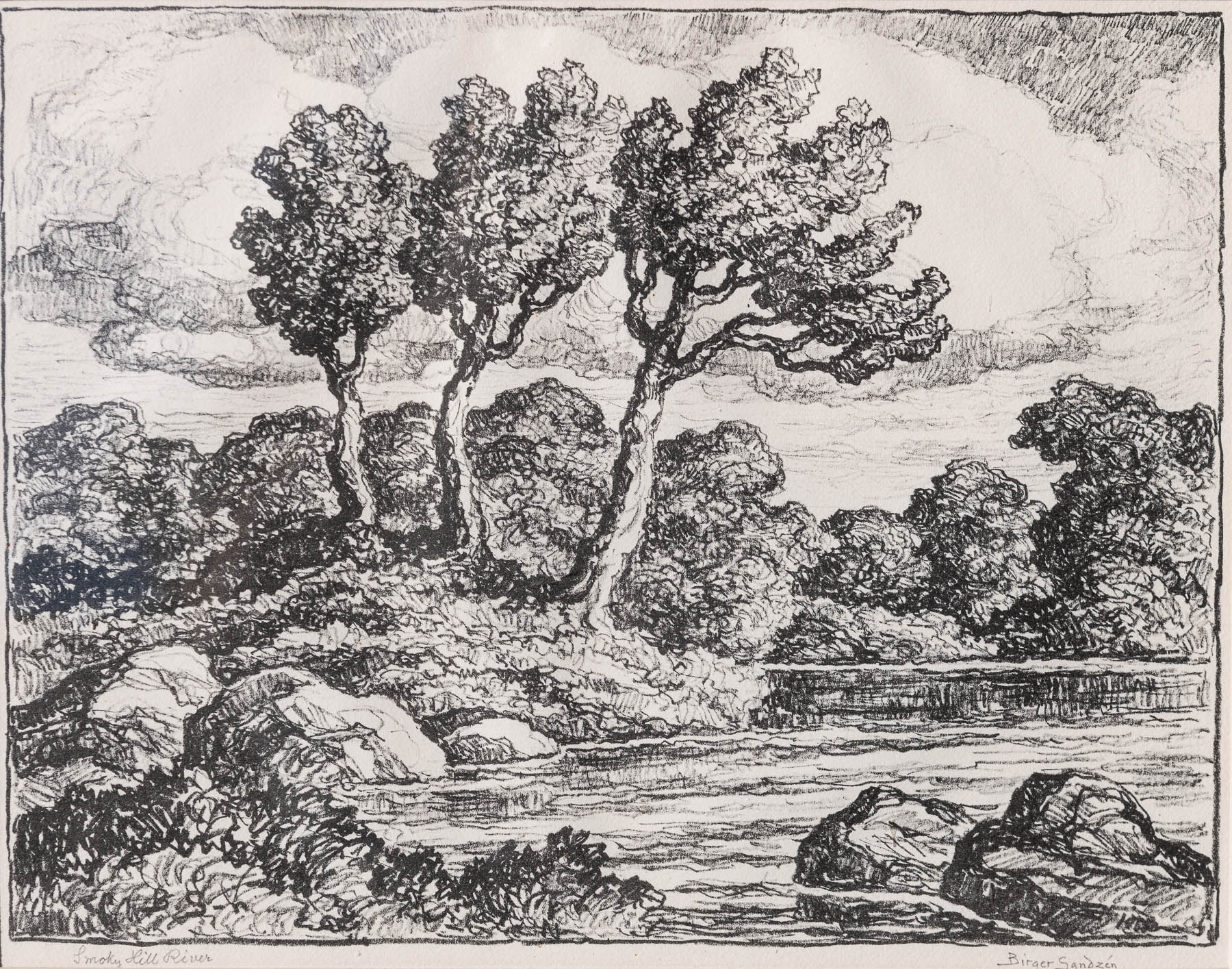 Birger Sandzén ( 1871-1954) Smoky Hill River lithograph, 1938 – pencil signed lower right, titled lower left approx. 11 x 14.75″ framed – p.o.r.