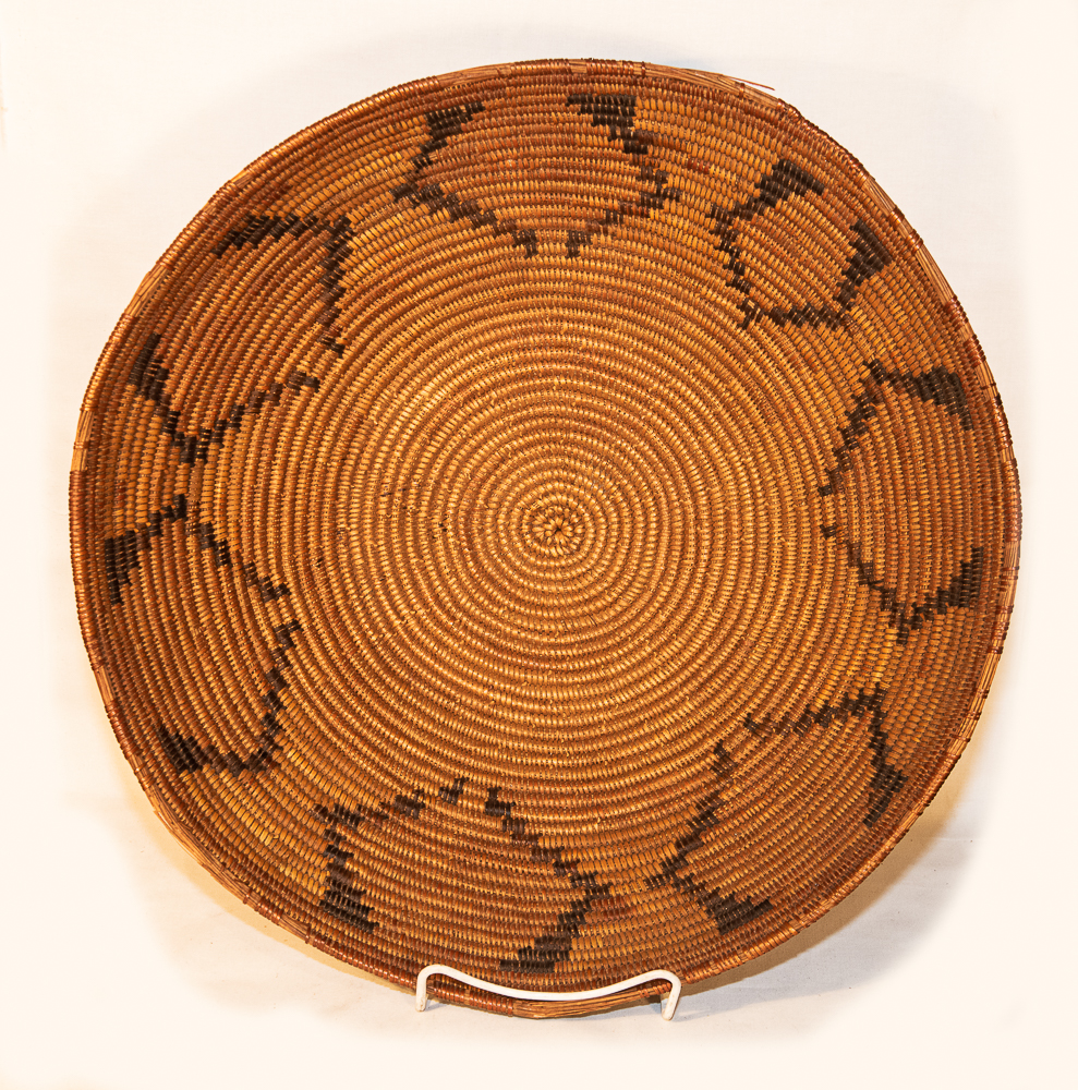 Mission basket with ten pointed star15.5" d juncus and sumac, probably Kumeyaay.