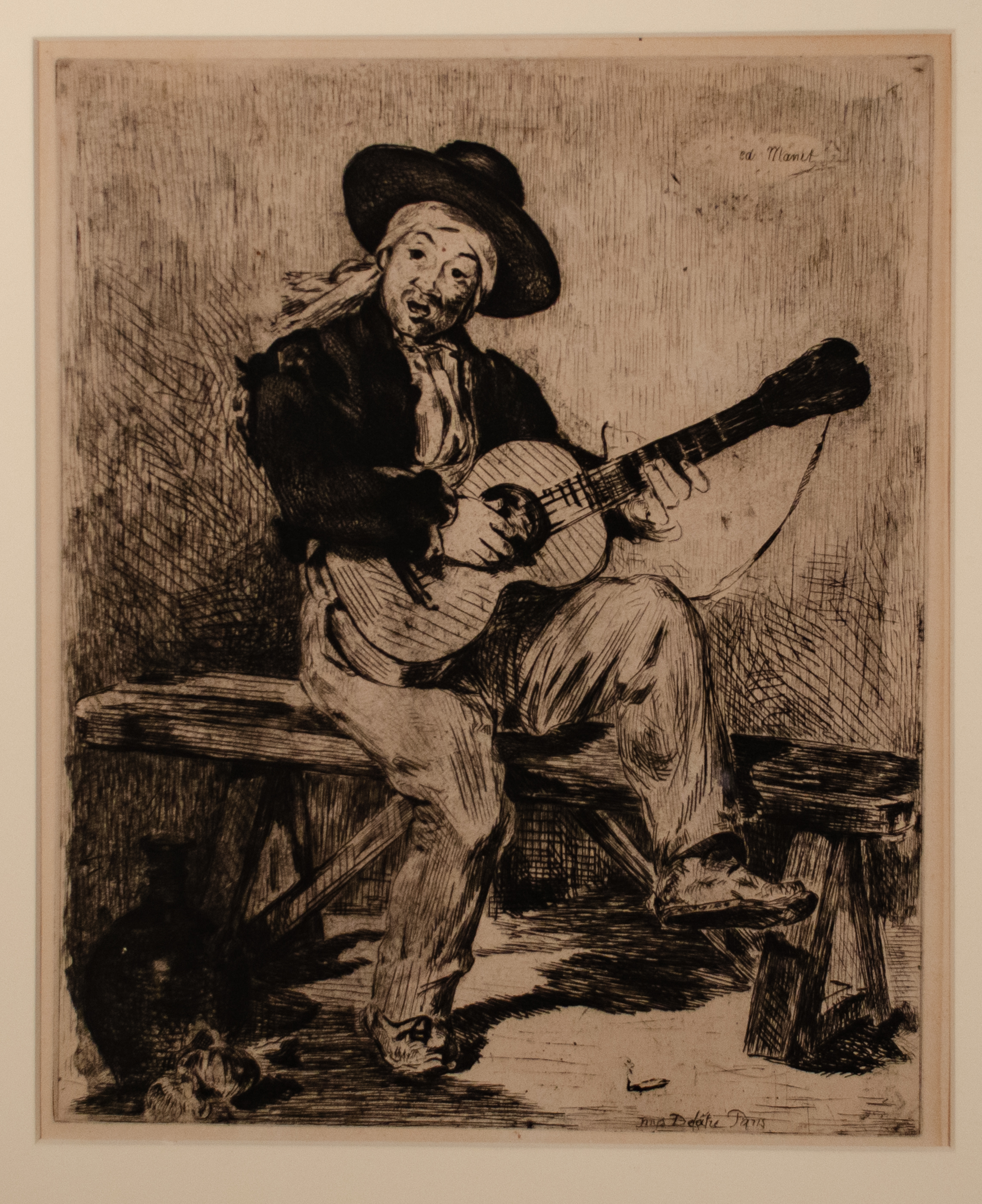 Edouard Manet Edouard Manet (1832-1883) Le Chanteur Espagnol (The Guitar Player) etching fifth state, 1861 14 3/8 x 10 3/4″ full margins, no issues, great print, framed p.o.r.