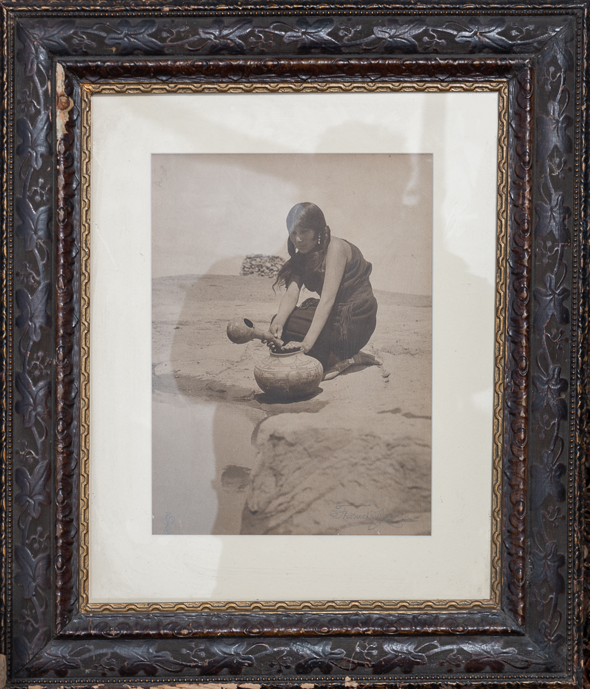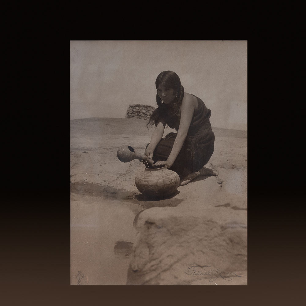 Frederick Monsen (1865-1929) Rare toned gelatin silver photograph Hopi woman at the well with water jar, Walpi. Image 18 x 14″. Circa 1900-1920 Elegantly period framed, signed lower right w/ thunderbird cartouche lower left. $1400