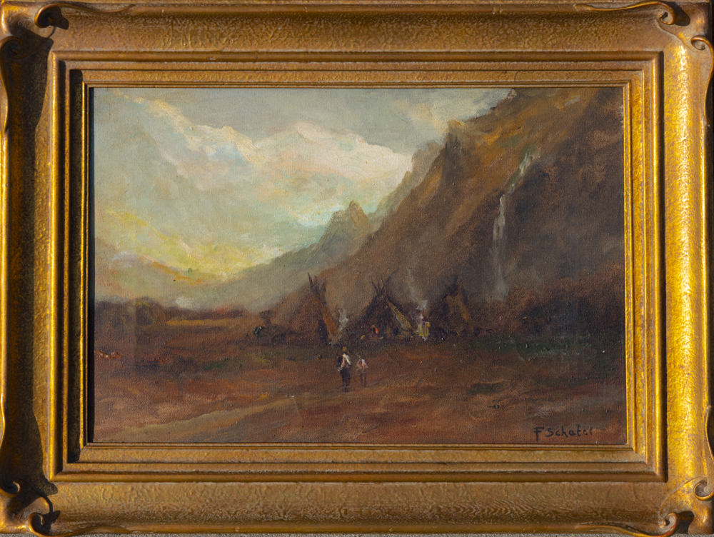 From AskArt; Born in Braunschweig, Germany on Aug. 16, 1839. Schafer may have studied art in Düsseldorf since his paintings resemble those of other Düsseldorf-trained artists; however, he is believed to have been self-taught. He came to the U.S. in 1876 and arrived in San Francisco in 1880. After establishing a studio, he began exhibiting regularly with the local art association and the Mechanics’ Institute Fairs. A peripatetic painter, he made regular sketching trips throughout the Northwest including Montana, Wyoming, Colorado, Idaho, Oregon, Washington, British Columbia, and Alaska. During his last years he painted theatrical scenery in San Francisco and Oakland theaters. Schafer had a home in Oakland from 1880 until his death on July 18, 1927. His landscapes, which often include Indians, were mostly done before 1890 and number about 500. Exh: Mechanics’ Inst. (SF), 1879-84; Calif. State Fair, 1880, 1894. In: Oakland Museum; Seattle Museum; Monterey Peninsula Museum; Shasta State Historical Monument; Bancroft Library (UC Berkeley); CHS; Crocker Museum; Hoover Inst. (Palo Alto); Museum of Church History & Art (Salt Lake City); Society of Calif. Pioneers; Sonoma Co. Museum (Santa Rosa); Yosemite Museum; Alameda Public Library; Craigdarroch Castle (Victoria, B.C.)