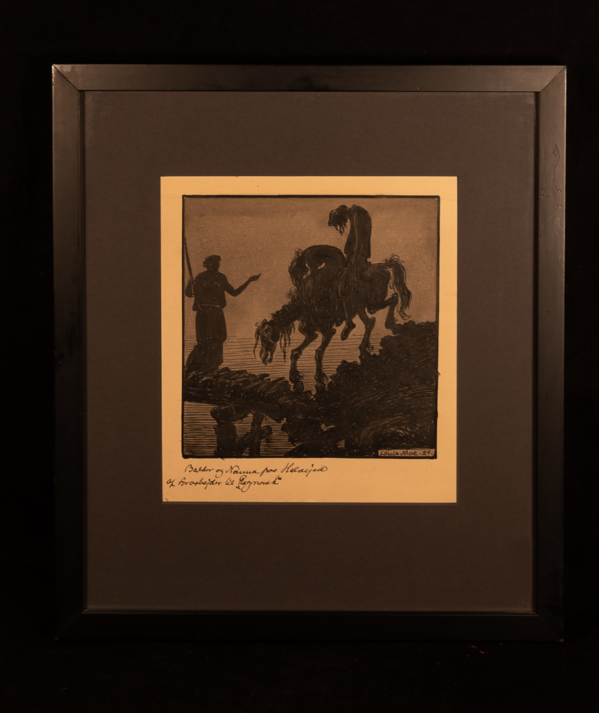Louis Moe Louis Moe (1859-1945) Norway Fallen Balder with his mother Nauma at the River Helayid 1929 9 x 8″, ink on paper, framed price on request (this photo has a little too much flash, there is a consistent dark in actual painting.)