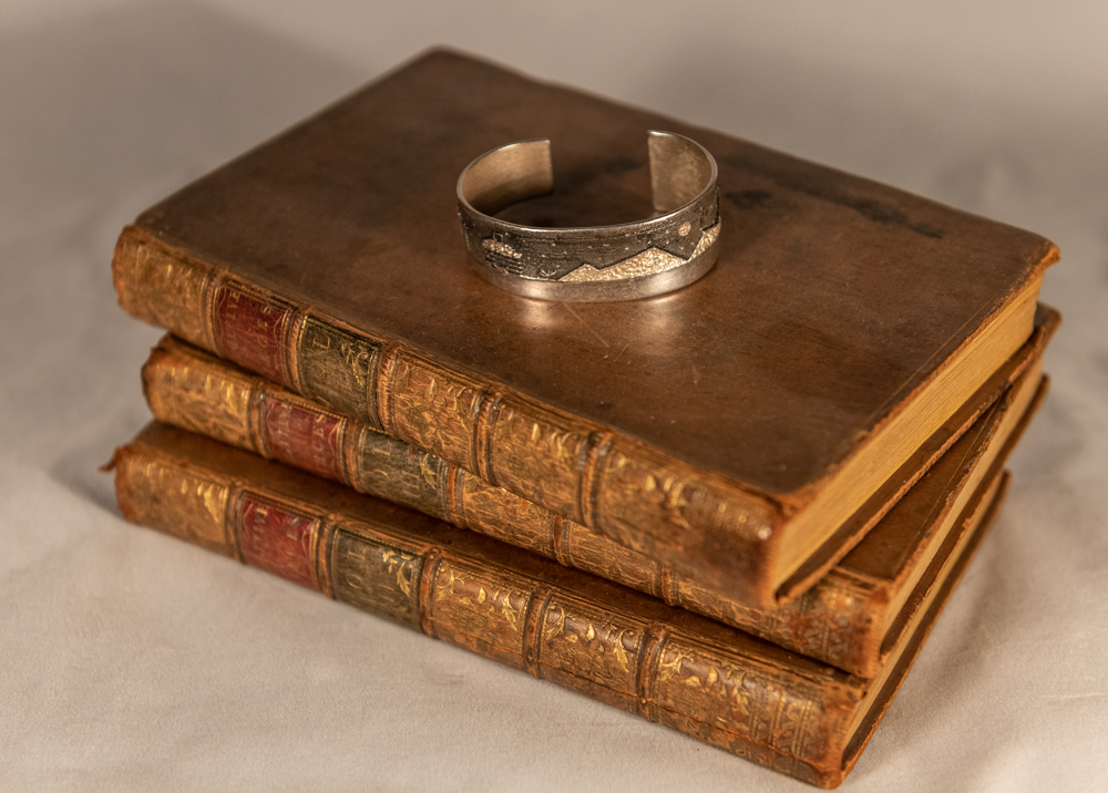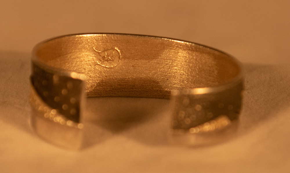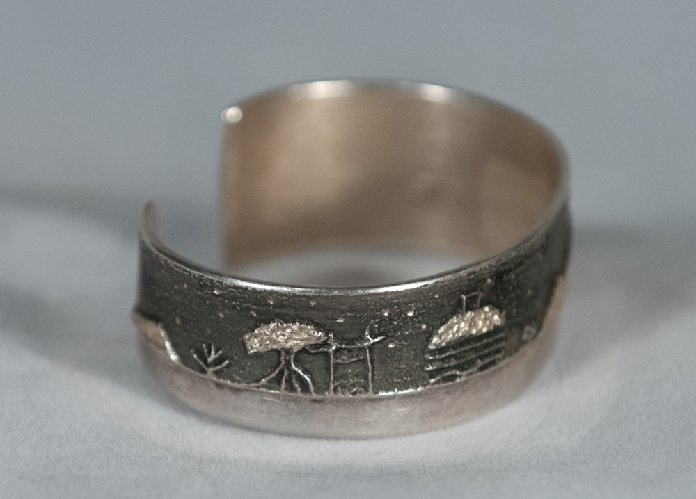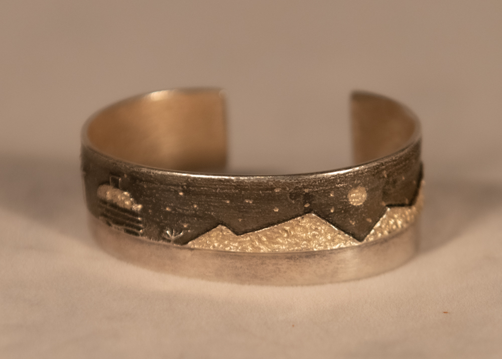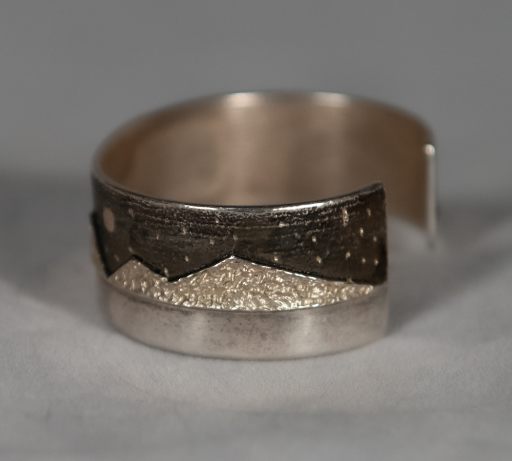 sterling silver “landscape” cuff with stars, trees, moon, mountains and hogan