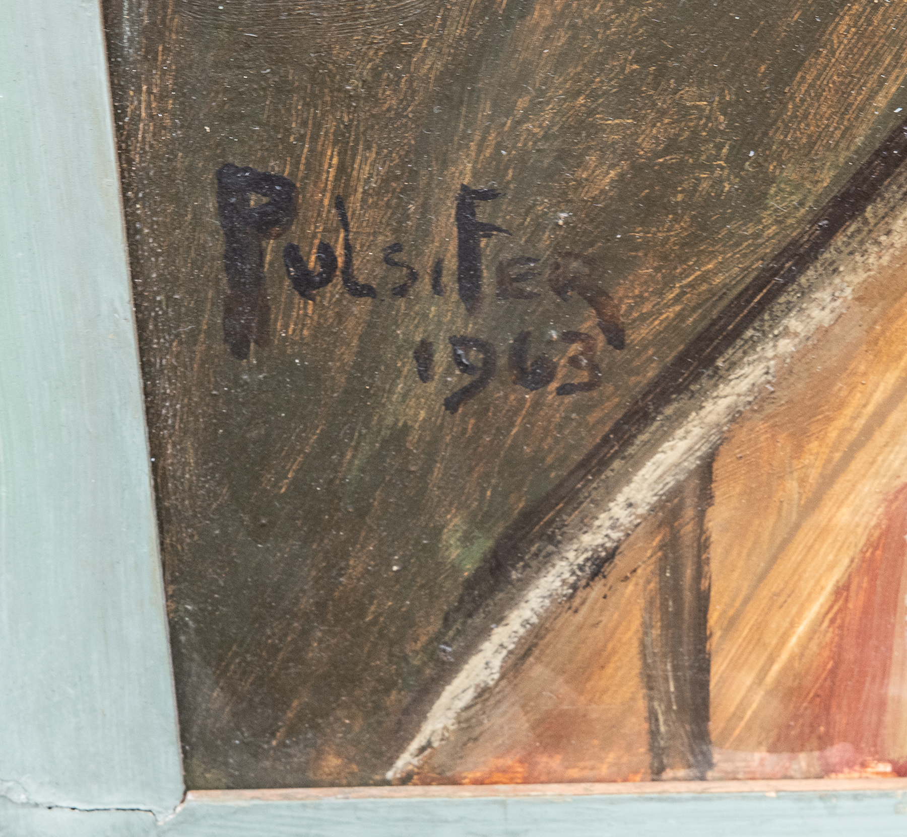From AskArt: Wilhelmina “Mina” Schutz Pulsifer was born August 3, 1899 in Leavenworth, Kansas. She was a graduate of St. Mary’s Academy in Leavenworth and attended the Kansas City Art Institute. Moved to San Diego, CA in 1924 and studied at the San Diego Academy of Fine Arts under Eugene de Vol and Otto Schneider. Also took art lessons from Nicolai Fechin and Frederick Taubes. Took up printmaking in the 1940s. Her painting style changed with the times from Regionalist scenes of the 1930s and 1940s to Expressionism in the 1950s, and figurative abstracts in the 1960s. During the 1960s she taught at the San Diego Art Guild and continued to