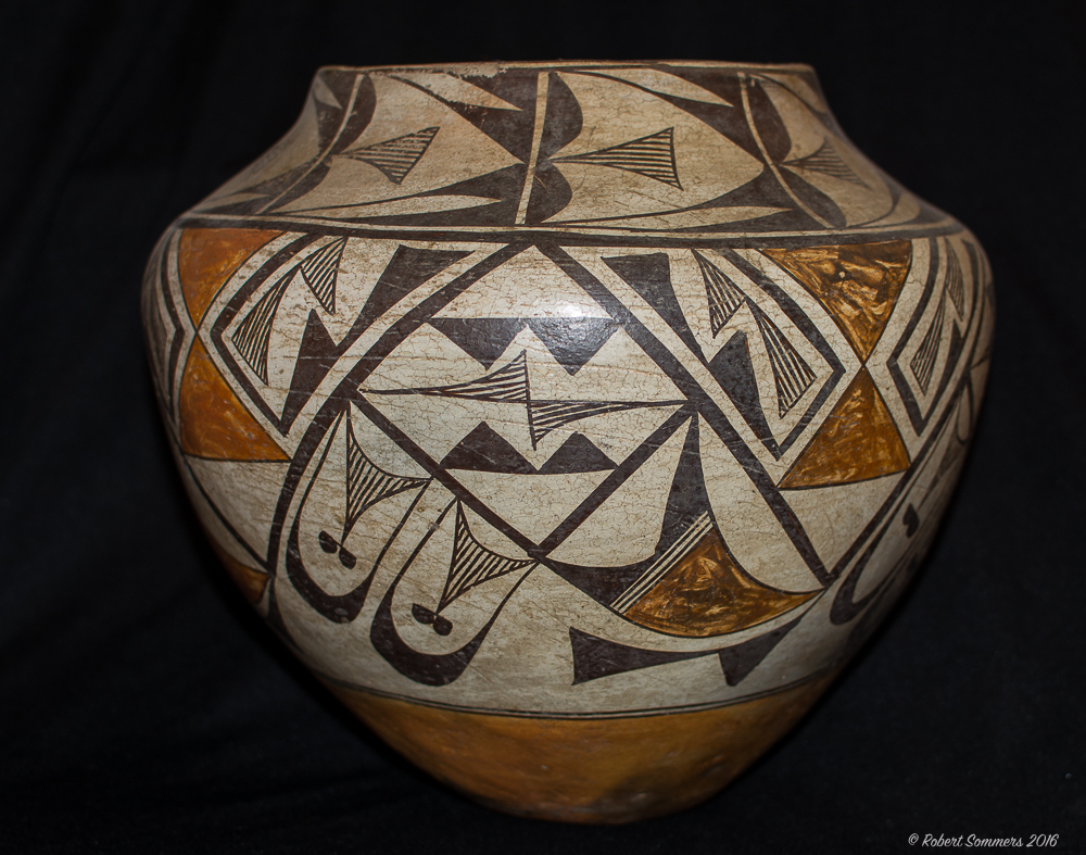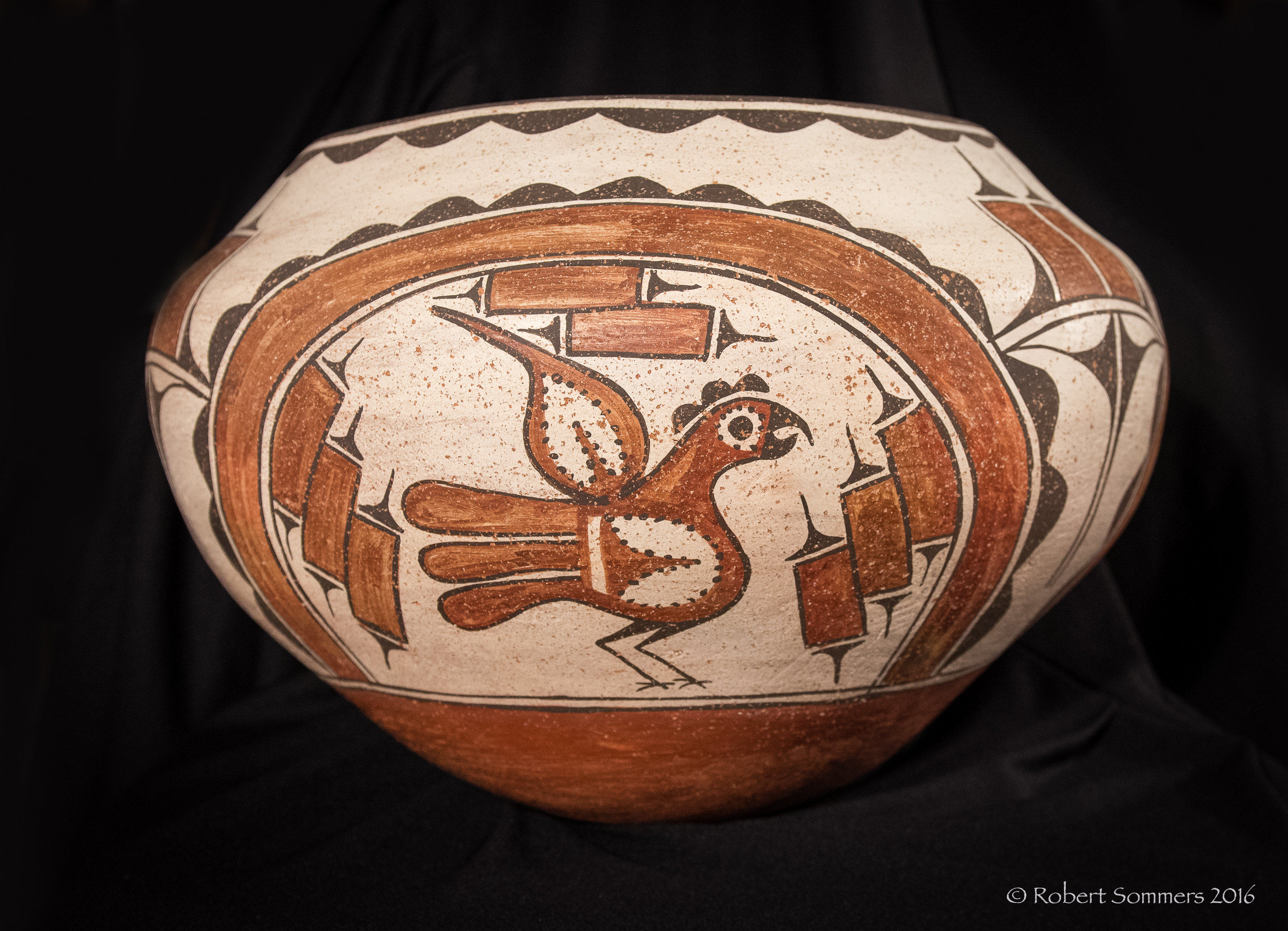 zuni2Large Zuni polychrome Olla, circa 1890-1910 with heartline deer , foliate medallion and bird  iconography. 10 x 14″, indented base. This is an honest jar with original wear and paint. Two cracks were stabilized by Andy but it has not been otherwise monkeyed with. Ladle wear on the rim is intact.  I bought this out of a central California Valley estate and was shocked when I saw how big it actually was. A great example for those who appreciate ethnographic pueblo pottery. sold