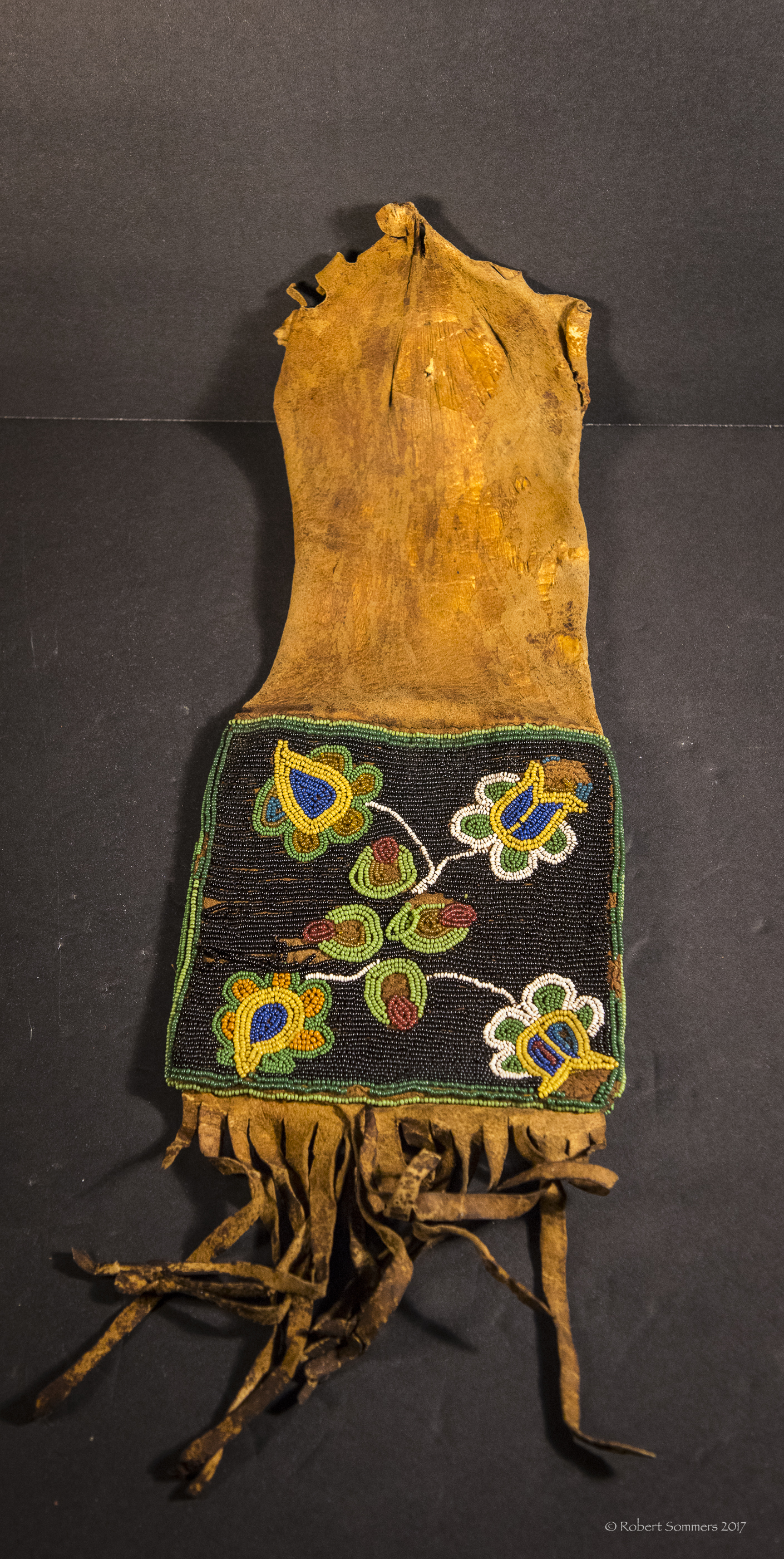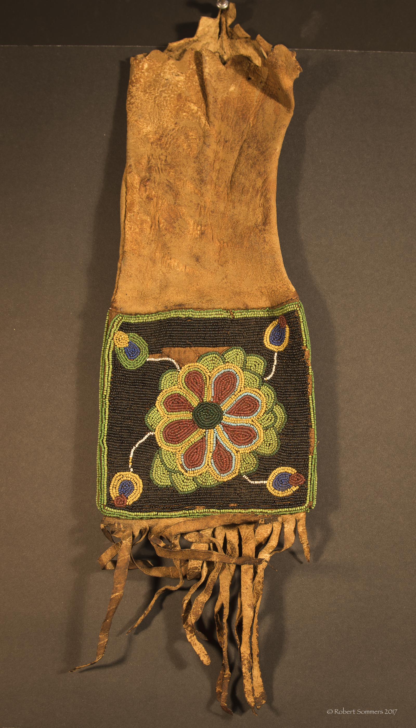 This bag was deaccessioned from a Northern California museum and has an ink registration number inside the lip. Minor restoration to quills, new fringe. sold Cree Pipe Bag, circa 1870-1880, some bead loss but very wonderful. sold