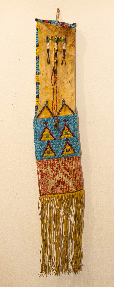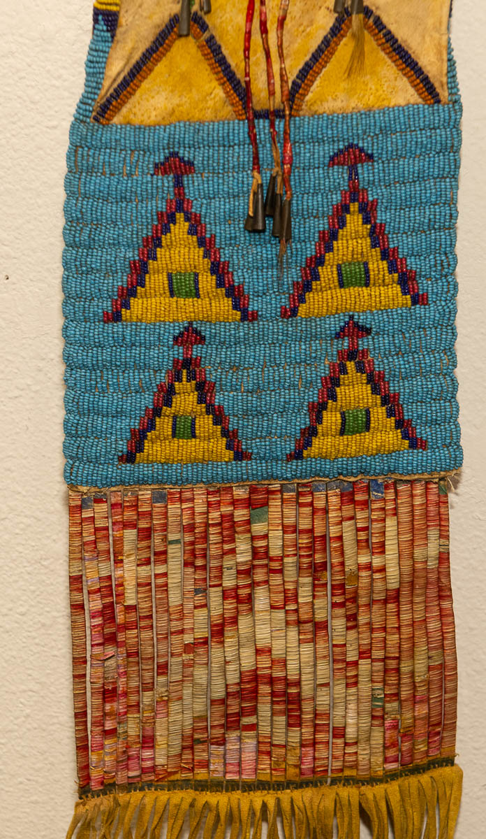 Sioux pipe or tobacco bag, circa 1880, tanned deerhide, woven with sinew, with glass beads, porcupine quilled slats and additional tin cone vertical strands. Teepee designs in both beads and quill panel with two H shapes and four small cross design elements. 38″ overall length.