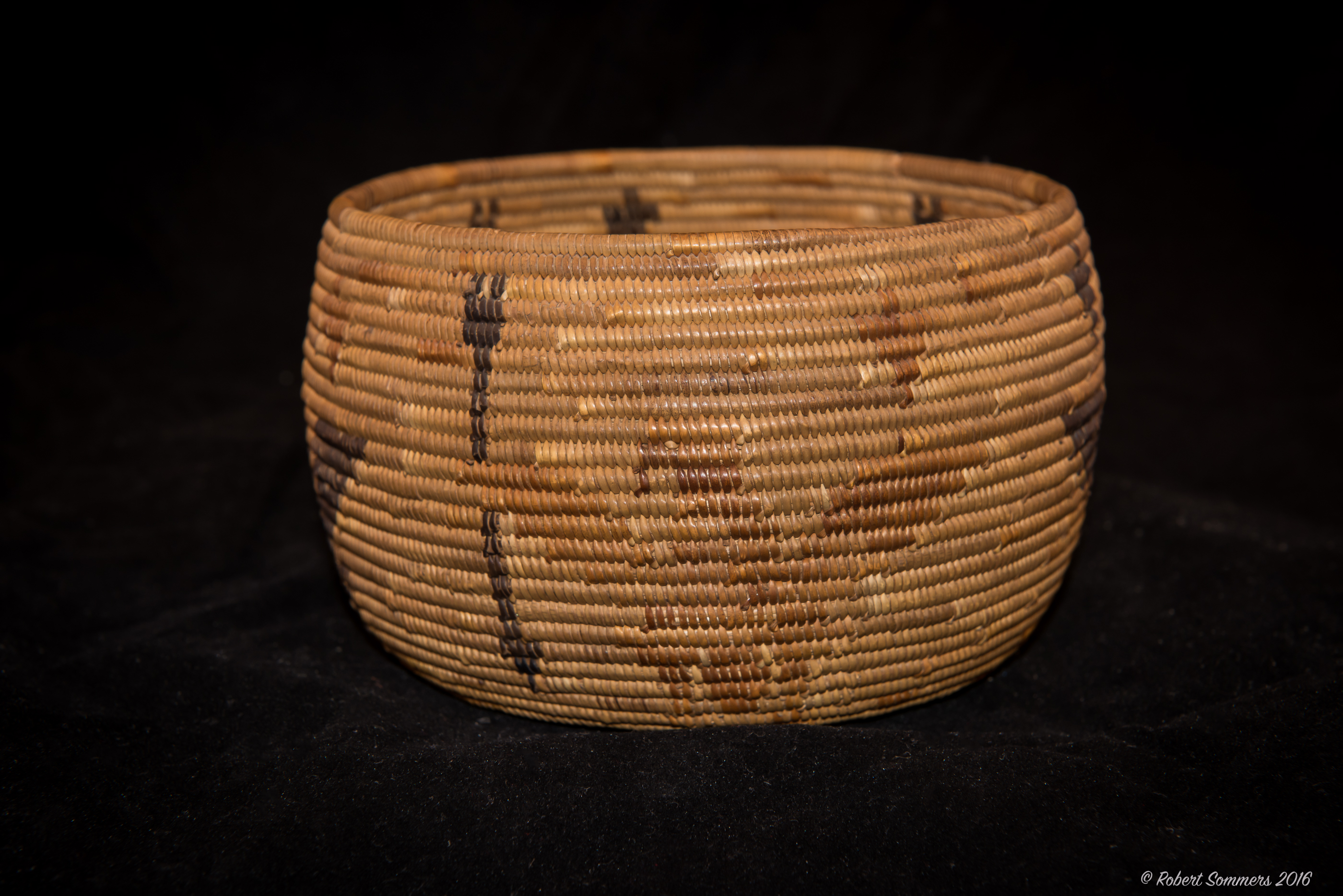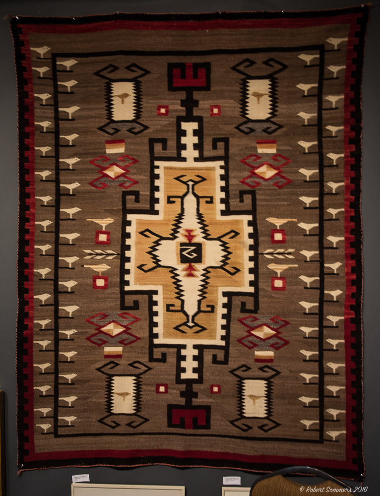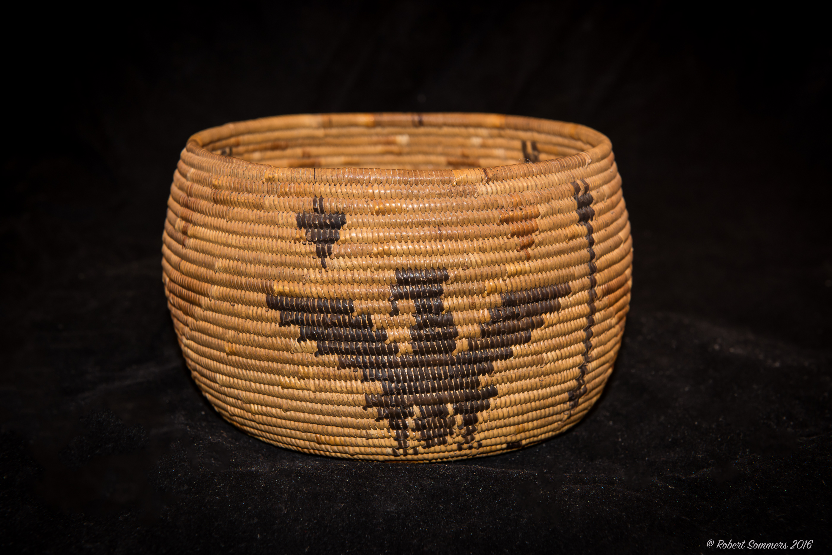 Beautiful and large acoma olla, circa 1910-20, original patina, no restoration 10 & 3/4″ x 12″ soldacoma (1 of 1)-3This is a fantastic navajo rug. 1930’s/40’s Bisti region black background with valero stars and shell scallops. 111″ x 68″ soldnr2 (1 of 1)This is an incredibly well woven 1920’s/30’s era navajo blanket. Very fine, incredible handle. 74 birds of all sorts. 68 x 52″ Absolutely gorgeous, best of class.soldnr (1 of 1)-2Early plains moccasins, possibly Ute. Lovely and supple, soldum (1 of 1)Gigantic Zia Olla with parrot figures  – Seferina Bell 19″ diameter at girth, signed, p.o.r.sb (1 of 1)-3Early Apache basket with multiple dogs and crosses, rare cross and circle iconography, possibly from daagadigha. 16″ diameter soldab (1 of 1)Early Mission rattlesnake basket 16 &3/4″ d. Two broken stitches at rim. mrb2 (1 of 1)-2mrb1 (1 of 1)early mission pictorial basket with condors, arrowheads and arrows, variegated juncas and sumac. 4 x 6″ From Don Bennett collection, soldmb4 (1 of 1)mb3 (1 of 1)-3mb2 (1 of 1)-2lalkawilas