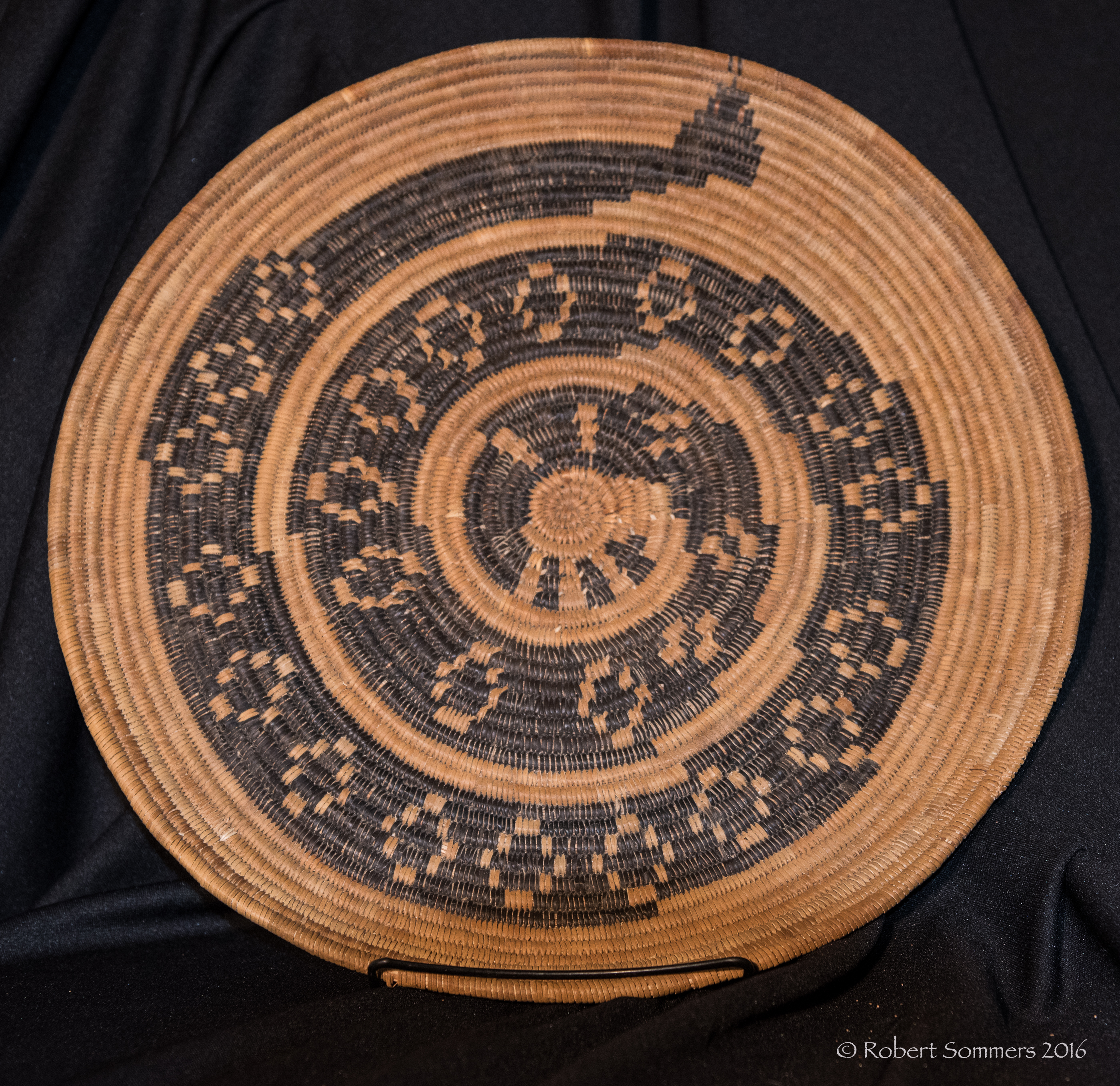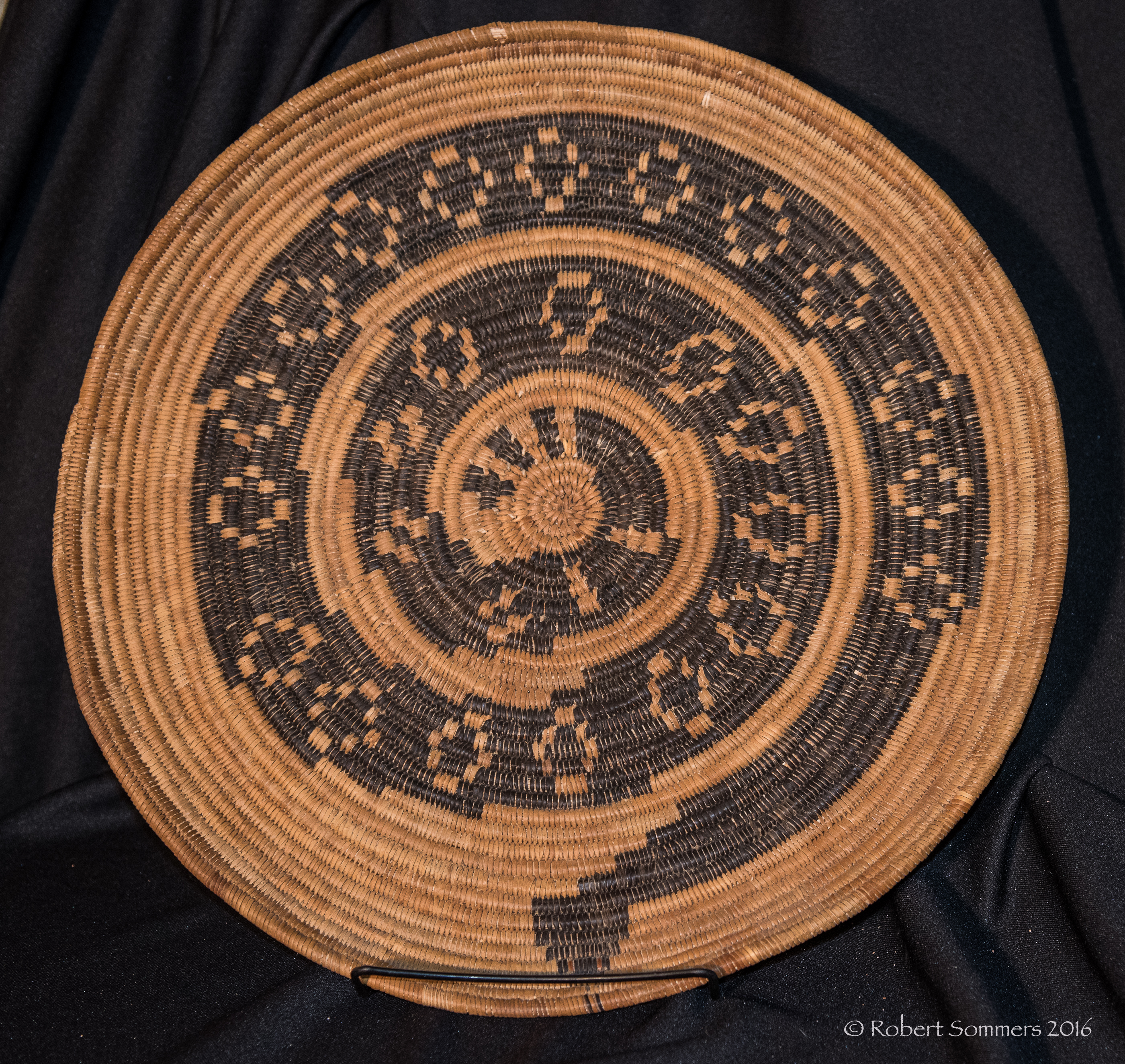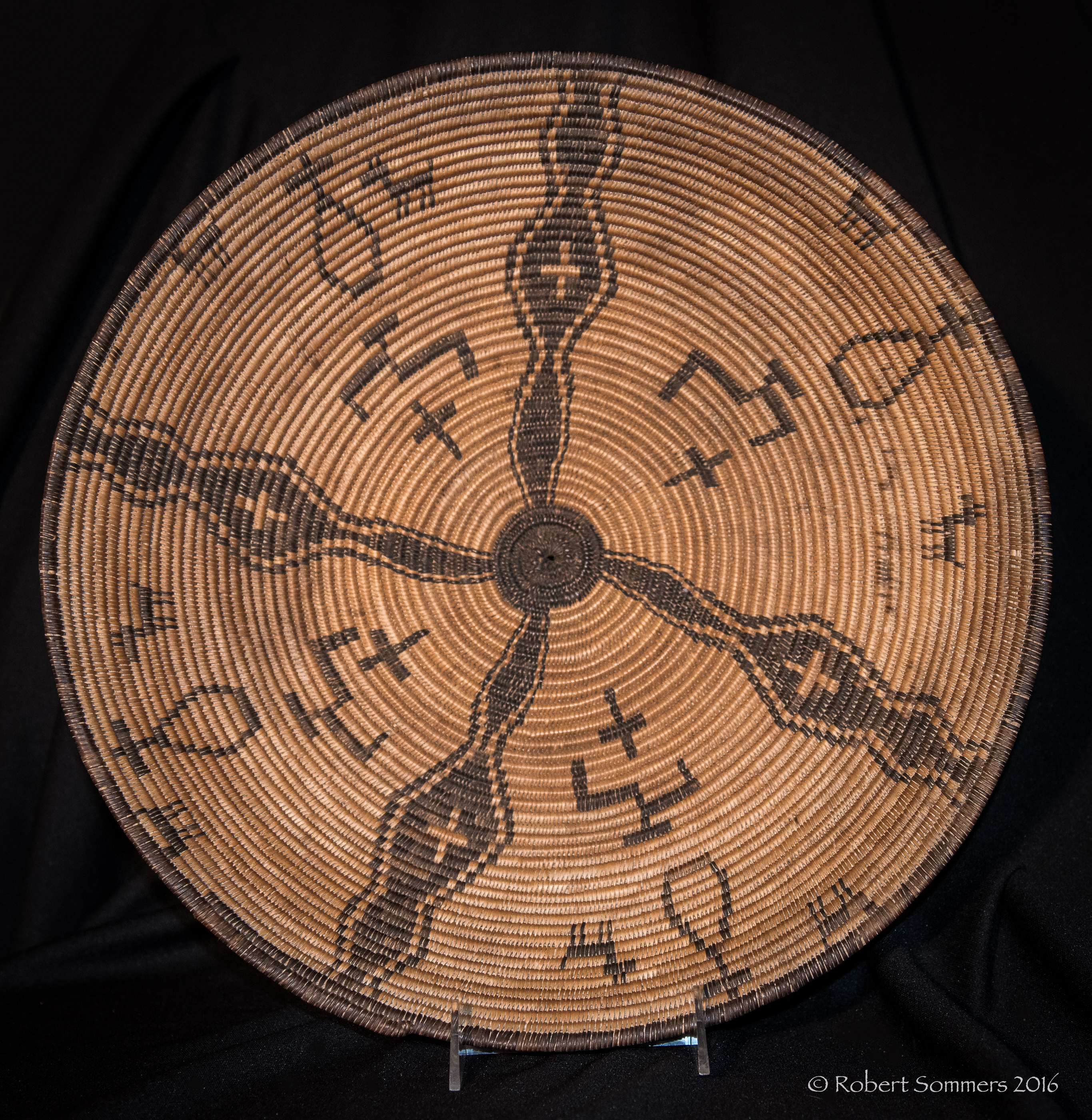 Large Yavapai Apache basket tray with radiating negative four pointed star design, tightly woven, willow and devil’s claw. 16&1/2″ diameter. 16 stitches to the inch. Circa 1900-1910, very fine condition.sold