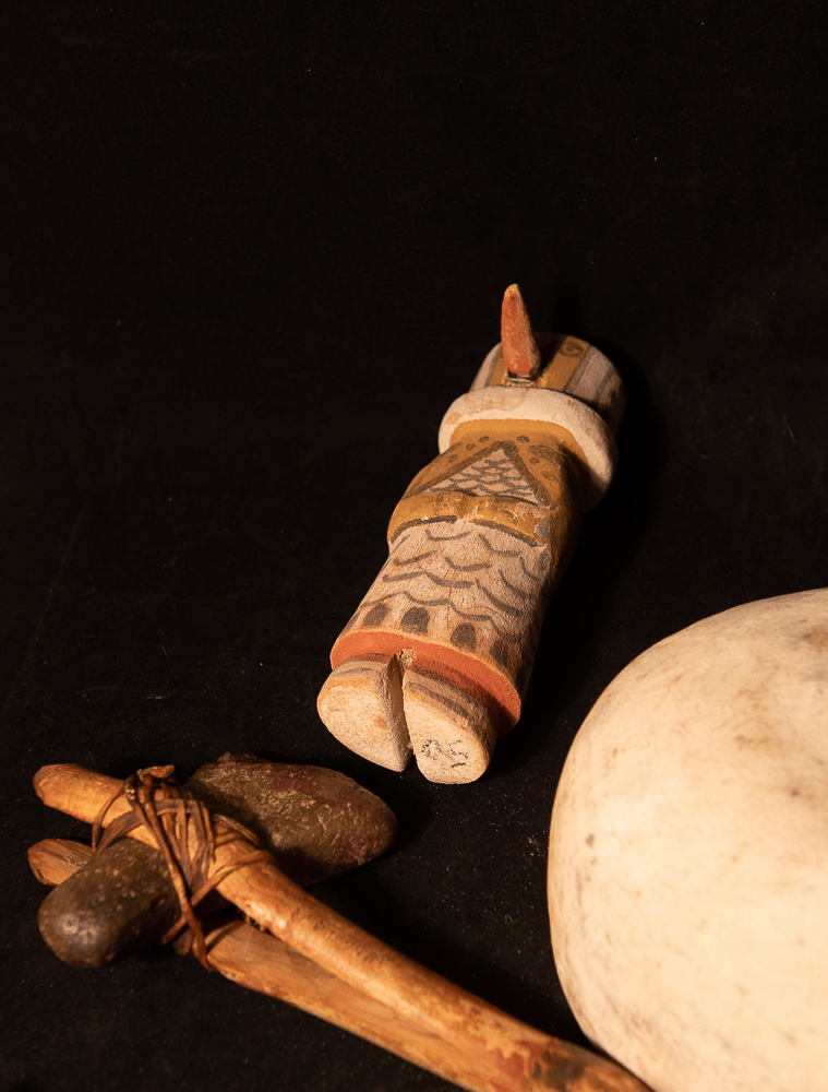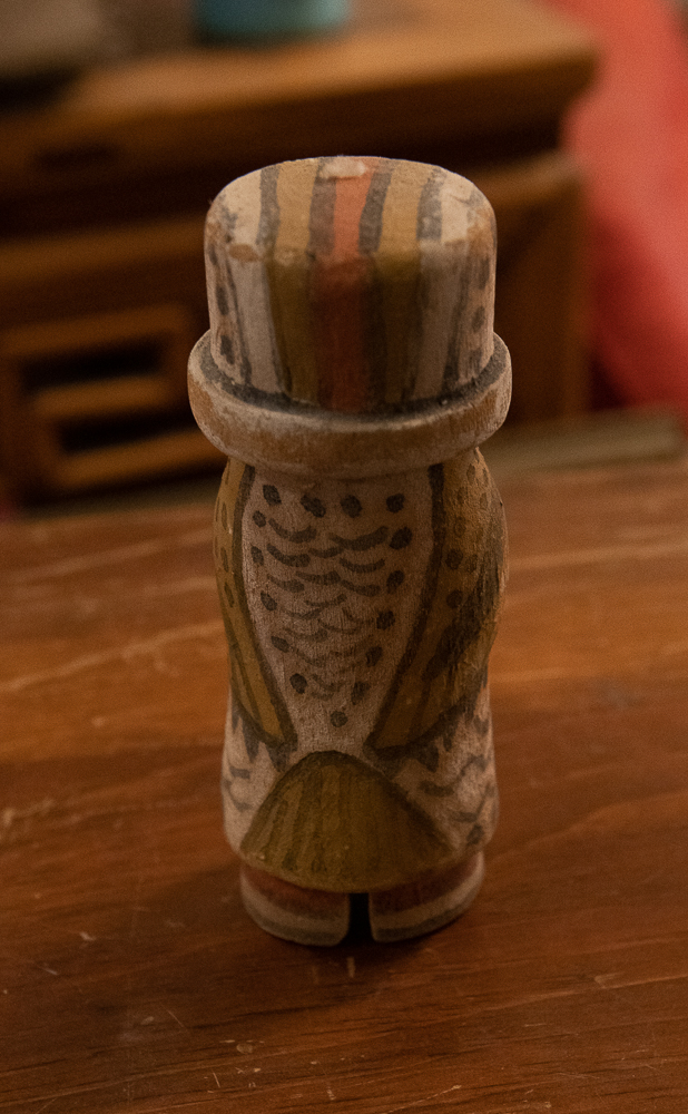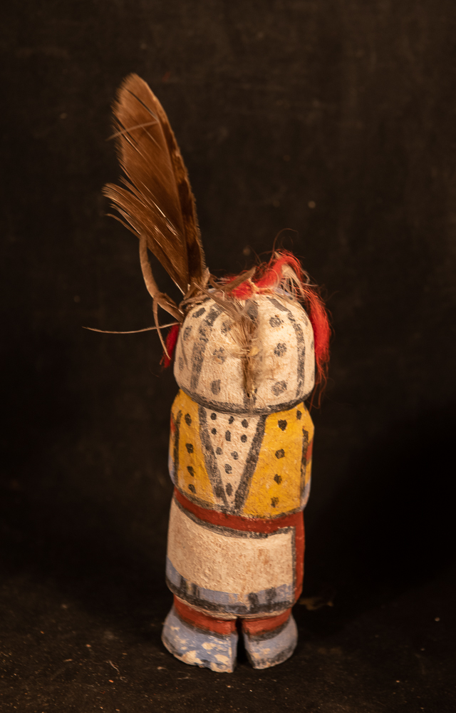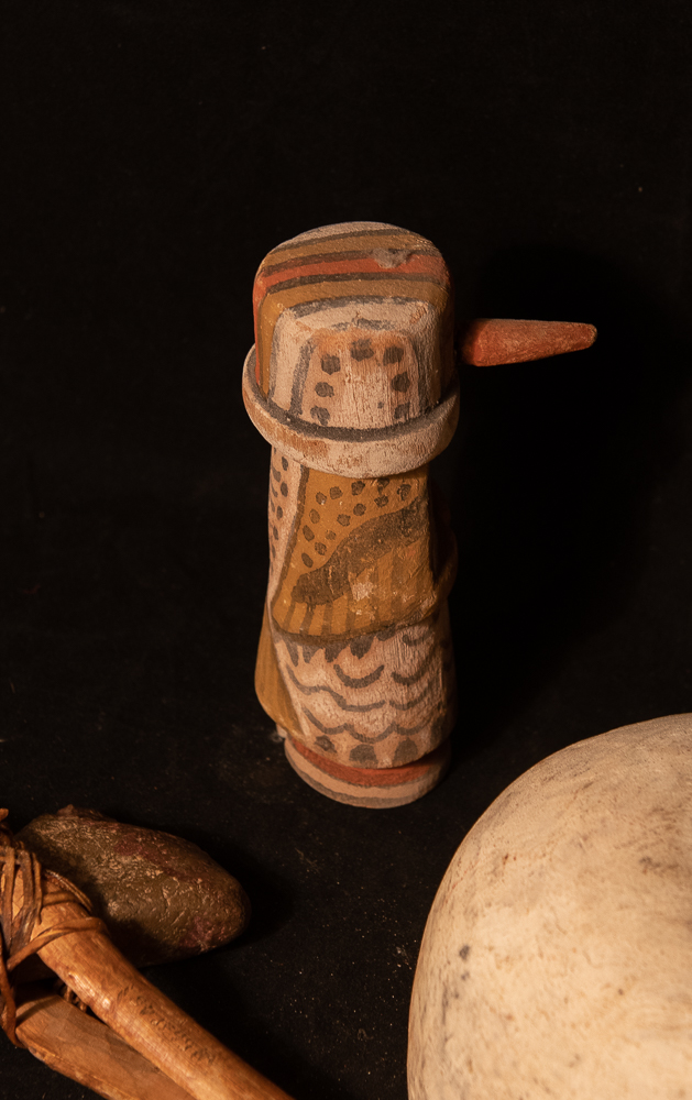 This Tawaquaptewa bird figure is just under 6″ tall. It may have had top feathers at one time. It bears some resemblance to a hummingbird kachina but looks to me more like a cactus wren or woodpecker. Very good unrestored condition. Unsigned.